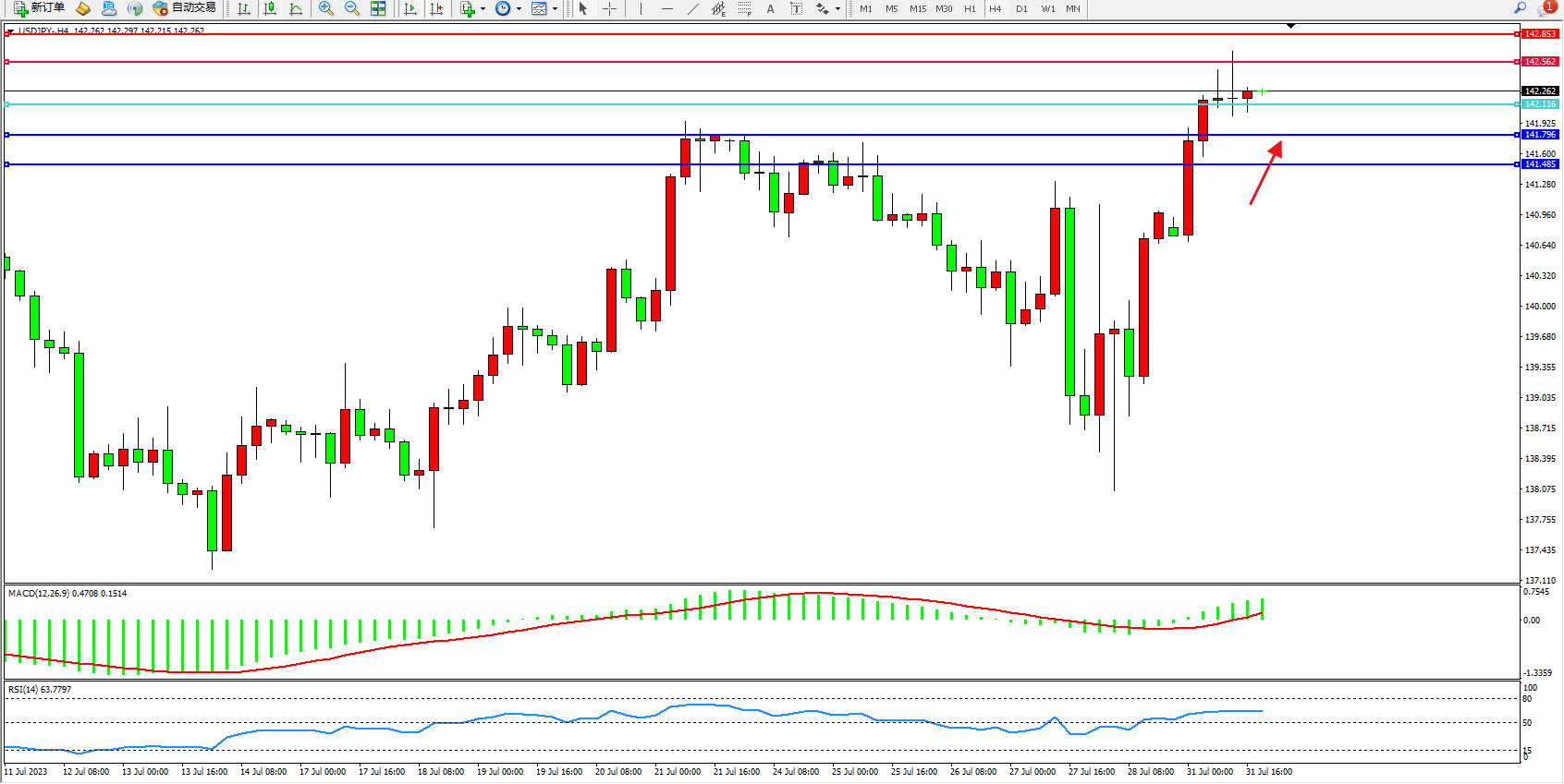 交易策略:142.116上方看涨,目标142.562  142.853