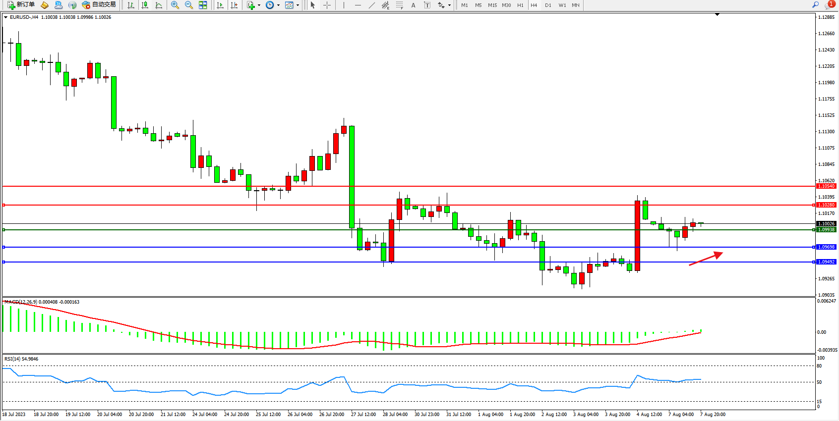 欧元美元EURUSD—4小时K线图显示:
