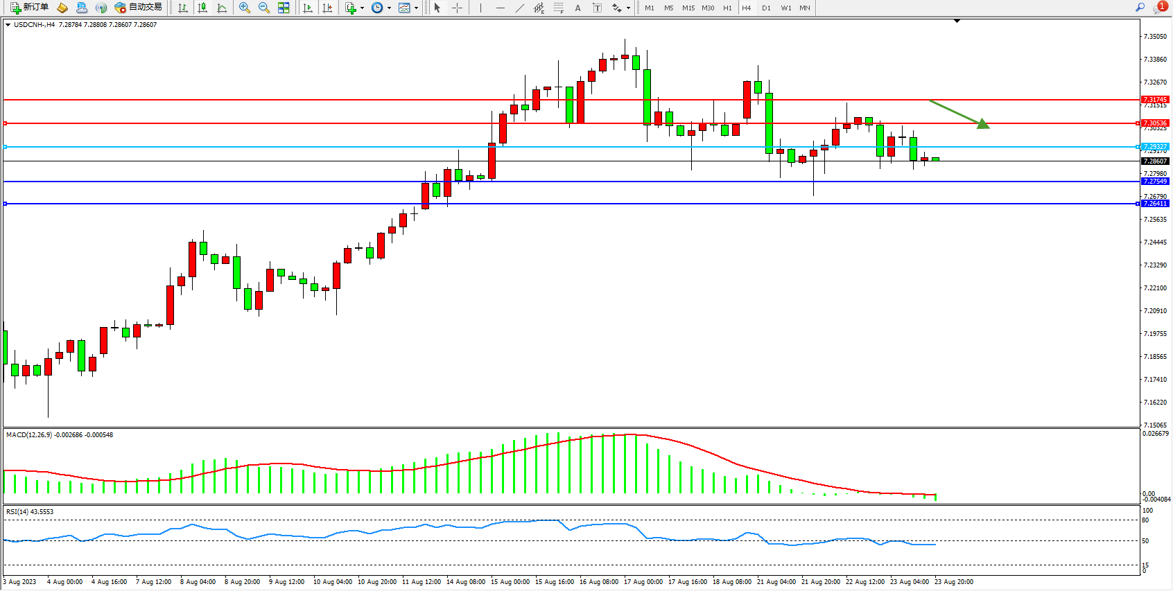 交易策略:7.29327下方看跌,目标7.27549  7.26411