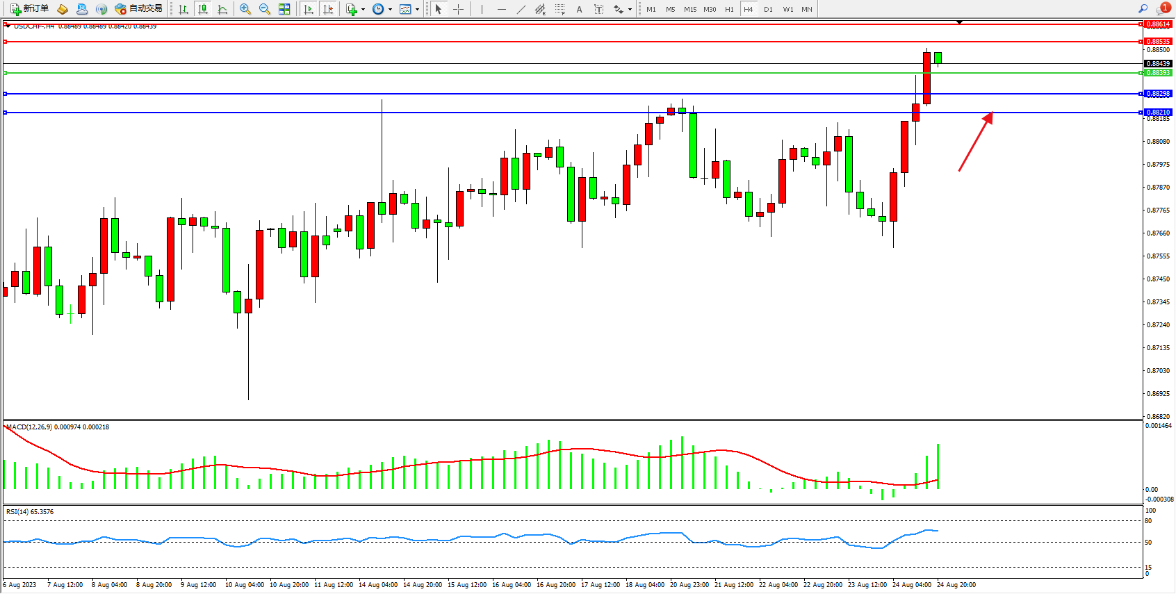 4小时图看:多头动力高位强势上扬,短期看涨情绪笼罩,市场多头不断攀升,MACD指标处于多头区域强势拉升,MACD指标处于50均衡线上側震荡;