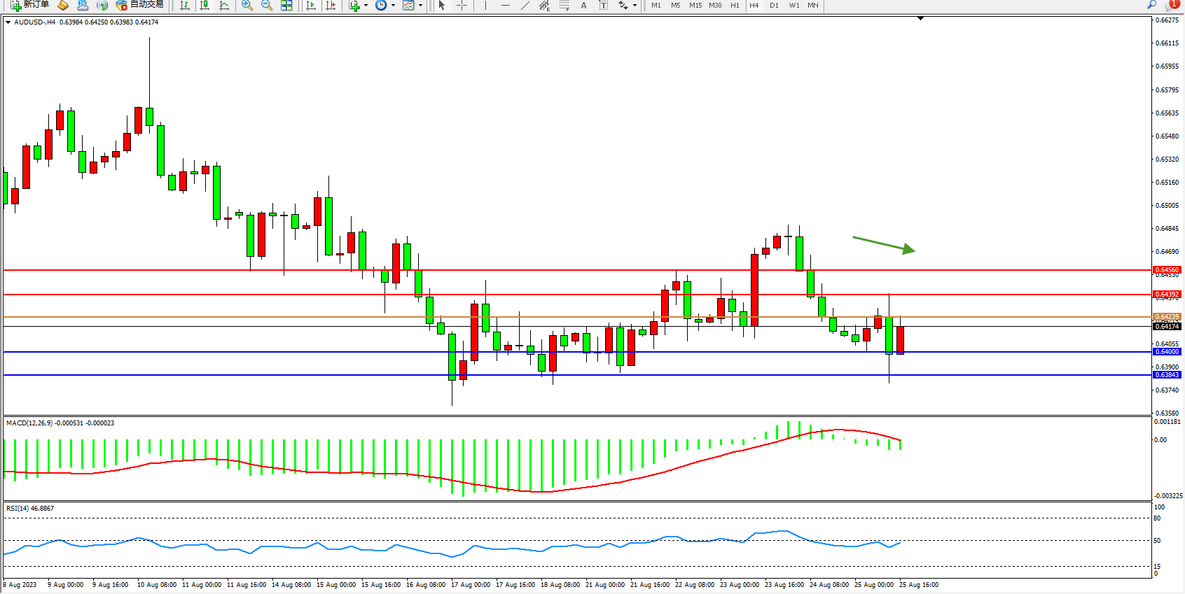 交易策略:0.64239下方看跌,目标0.64000  0.63843