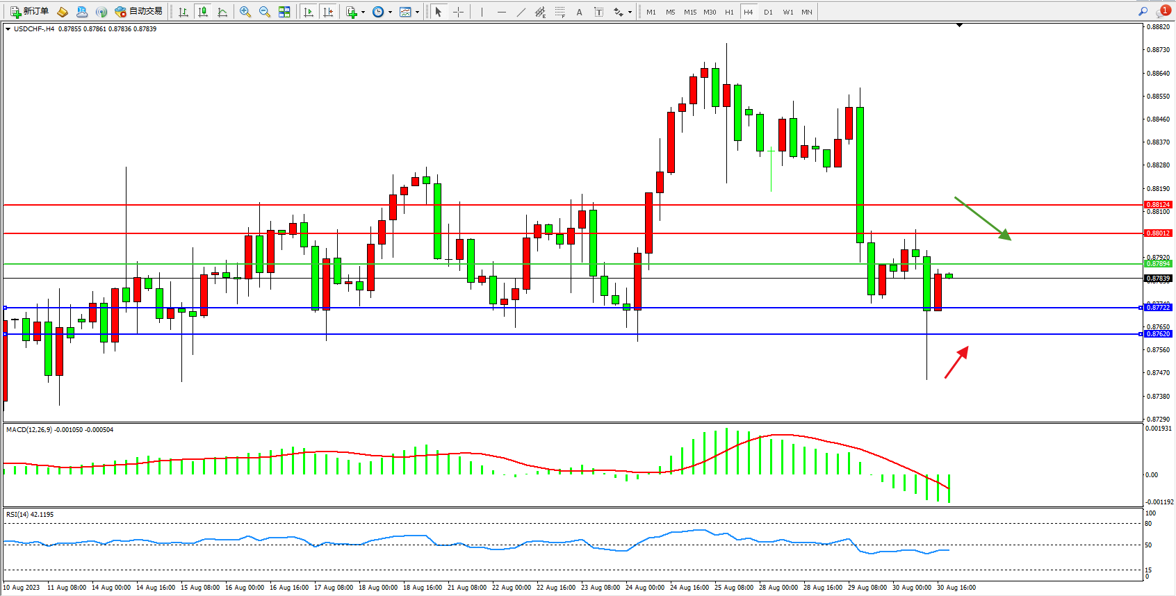 备选策略:0.87894上方看涨,目标0.88012  0.88124