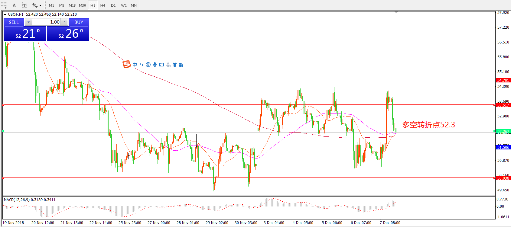 小时图看,油价冲高后连续回落,最后收于均线系统之上,也是多空转折点的52.3附近,MACD红柱缩短,短期内震荡整理概率较大。