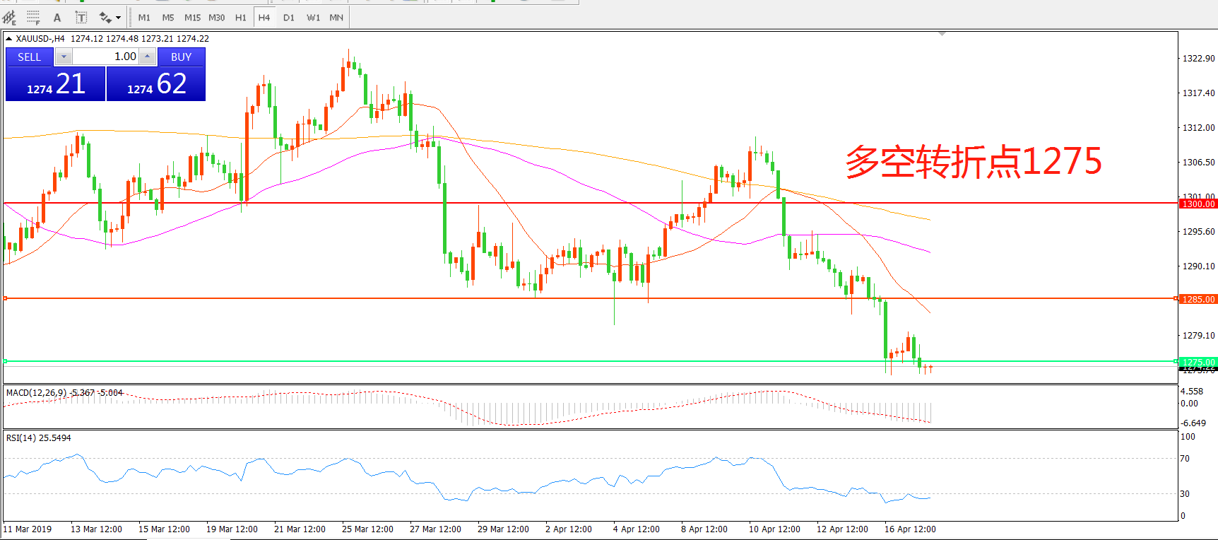 4小时图看,金价连破1285、1275两道关口,短期走势疲态尽显,均线系统呈空头排列,MACD绿柱增加,日内以空头思路为主。