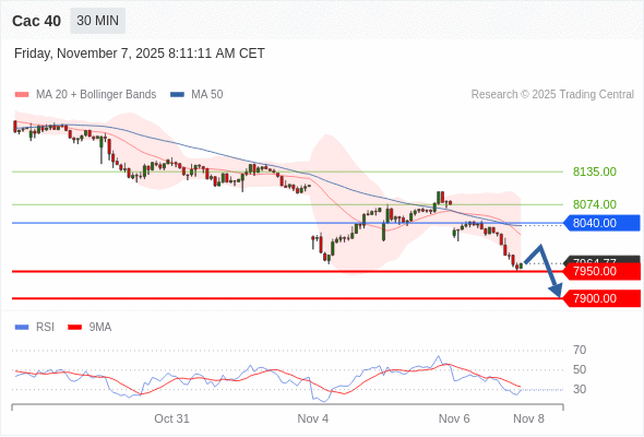 交易策略: 在 8040.00 之下,看跌,目标价位为 7950.00 ,然后为 7900.00 。