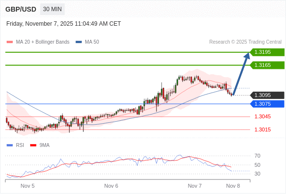 在 1.3075 之上,看涨,目标价位为 1.3165 ,然后为 1.3195 。