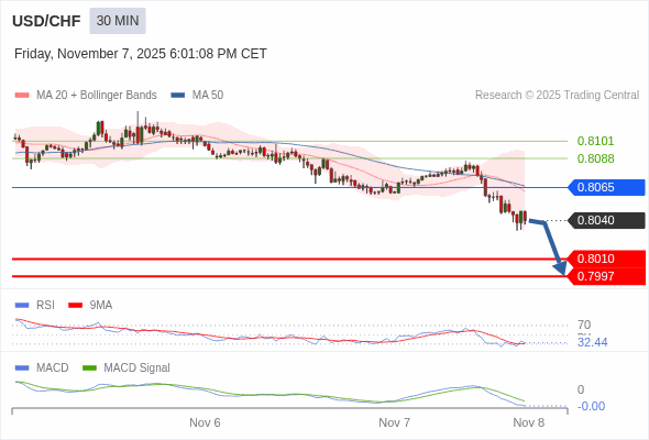 美元/瑞郎 当日内 : 看跌,在 0.8065 之下。