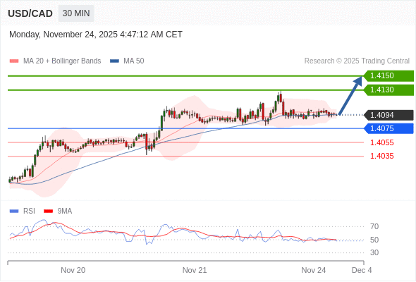 在 1.4075 之上,看涨,目标价位为 1.4130 ,然后为 1.4150 。