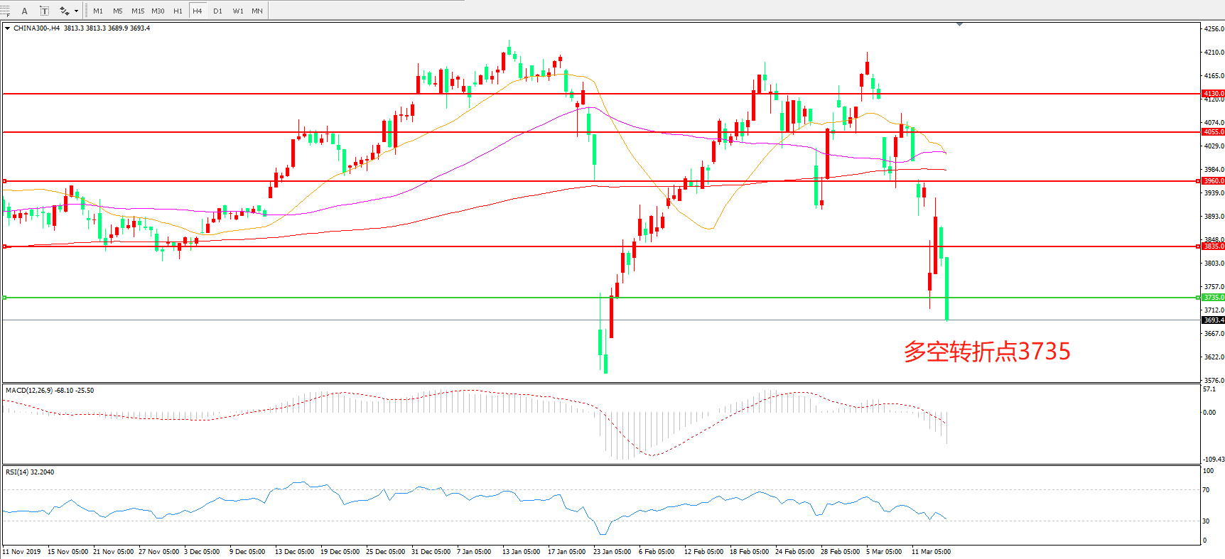 4小时图看,沪深300低开低走,整体表现低迷,均线系统走平,MACD绿柱增加,RSI指标走平,日内延续下行概率较大。