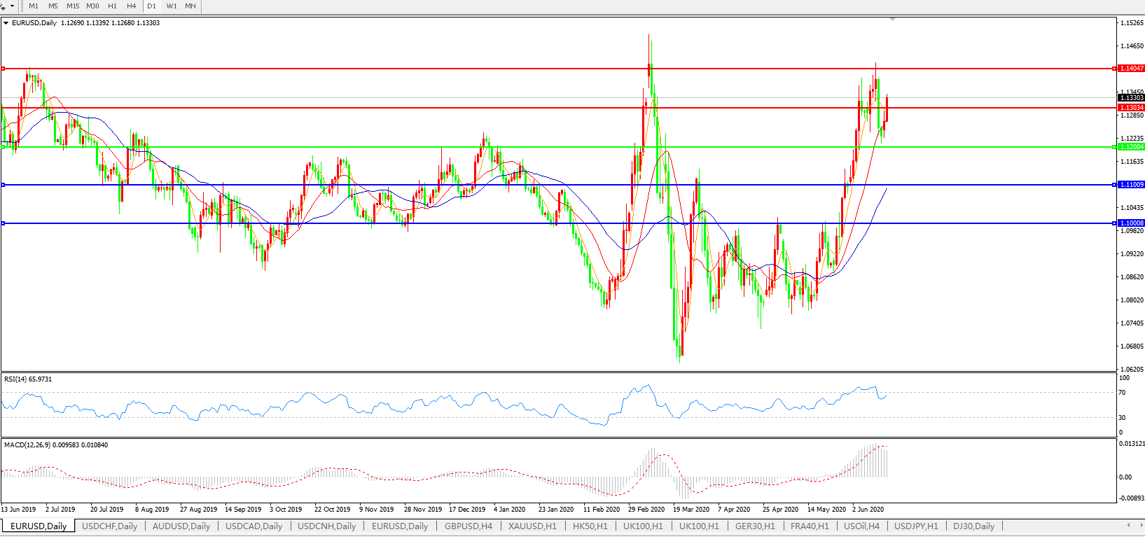 技术面简析:日图均线整体呈多头排列,汇价止跌后大幅拉升,MACD运行于0轴上方且量能再度微放量 ,RSI回落后再度小幅走升,预计汇价大概率将进一步上行,关注上方1.14关口压制。