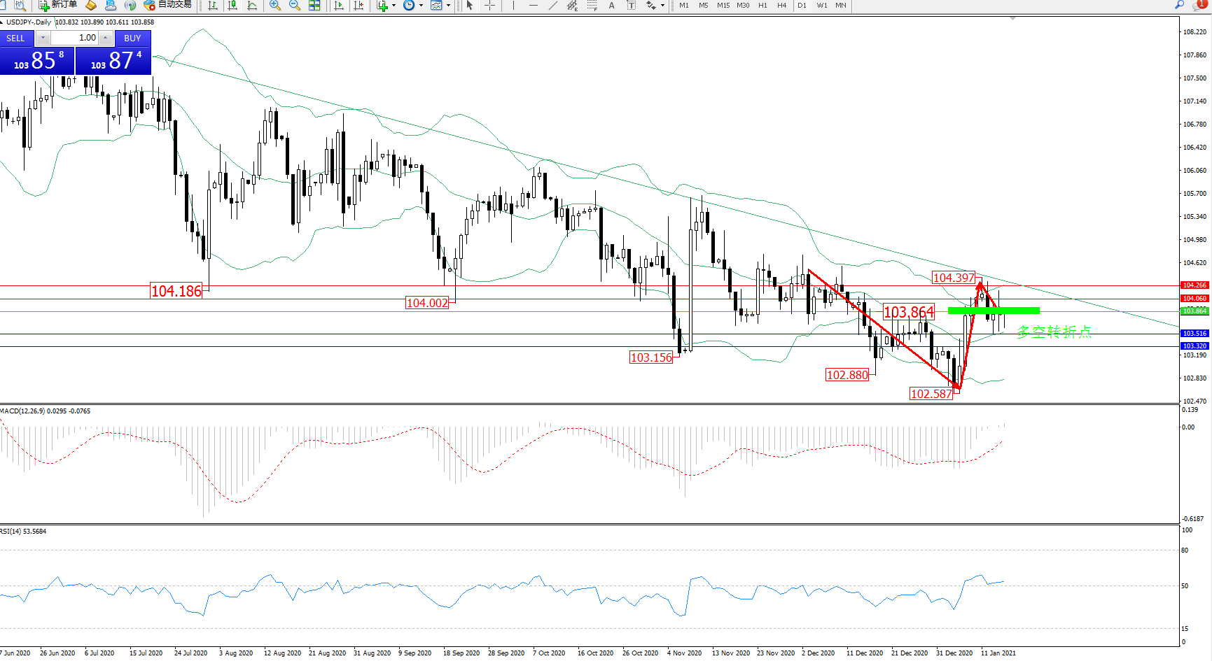技术点评:空头动力延续布林带指标通道内持续震荡下行至102.587位置后得到支撑开始强势反转拉升上扬,高位抵达104.397位置遇阻回撤,空头动力伺机再度入场下行,处于布林带指标通道中上轨区间持续震荡中,关注中上轨区间关键节点,布林带指标呈缓慢张口走势中,MACD指标处于空头区域弱势震荡上移至0轴线附近徘徊,RSI指标低位多头动力上攻至50均衡线上方持续震荡整理中;