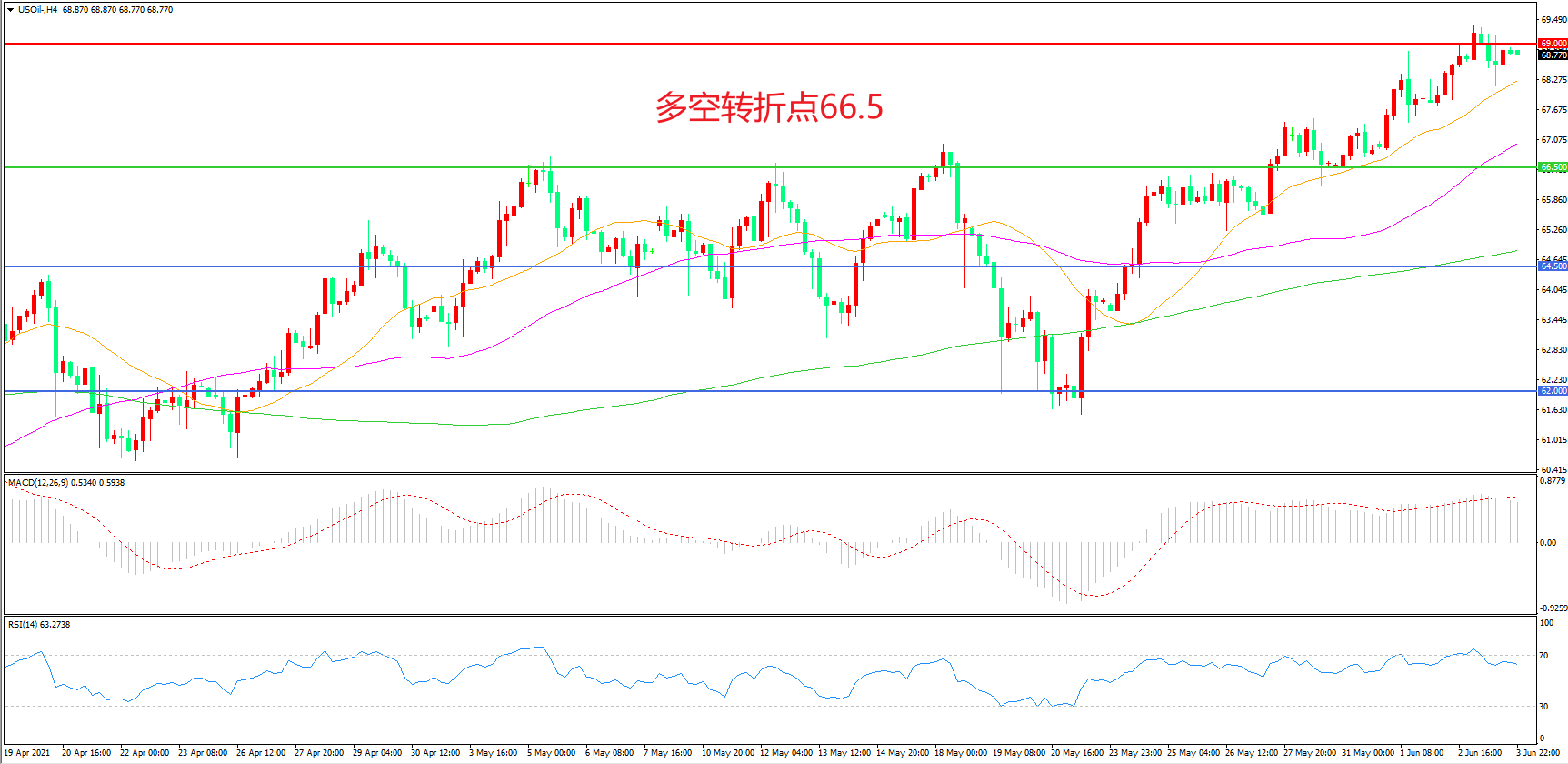 周四(6月3日),美国汽油需求近期达到疫情爆发以来的最高水平,美国机场客流量达到了2020年3月初以来的最高水平,油价多头信心受到提振,美国WTI原油延续高位震荡,收报68.81美元/桶。从昨天美元指数大涨来看,原油价格似乎并没有受到较大的影响,油价表现较为坚挺。