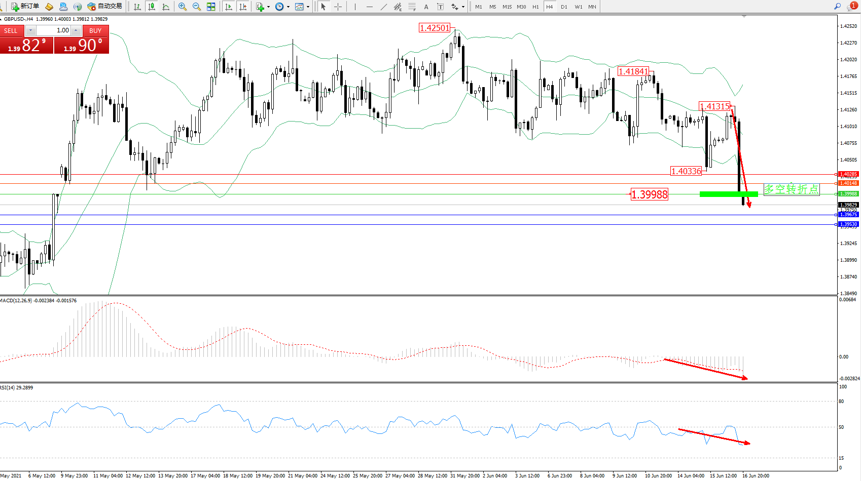 北京时间周四凌晨2点整,美联储公布最新的6月利率决议,美联储维持利率0-0.25%不变,符合预期。到2023年底,美联储将加息两次。 英镑兑美元自5月10日以来首次失守1.40关口,触及日低1.3999,因美联储鹰派政策措辞引发美元强势反弹,而非美货币因此普跌。英国央行行长贝利和多数央行官员表示,通胀率的上升将是暂时的,央行无须缩减其巨大的刺激计划。预计英国央行6月24日的最新会议将保持政策不变。