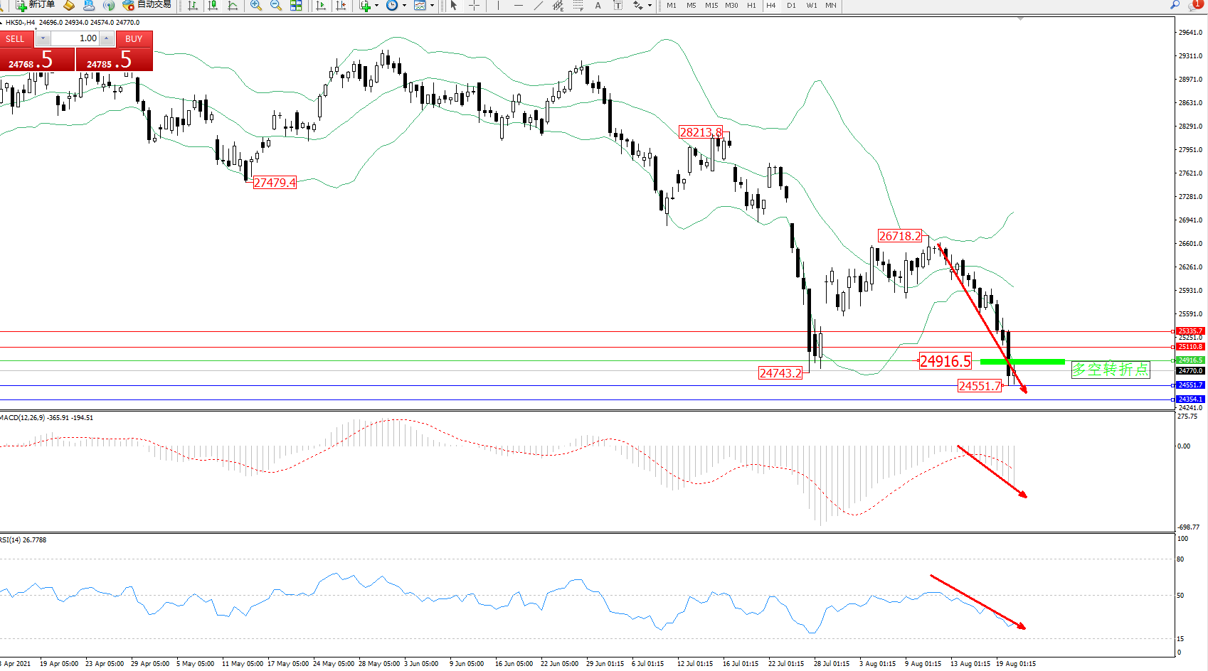 技术点评:空头动力延续布林带指标下轨附近持续下挫,跌破前期低位24743位置后抵达24551位置短暂得到支撑,空头动力依旧有继续下行态势,布林带指标呈张口走势持续中,MACD指标处于空头区域不断震荡下行,RSI指标处于空头区域持续详细移动中;