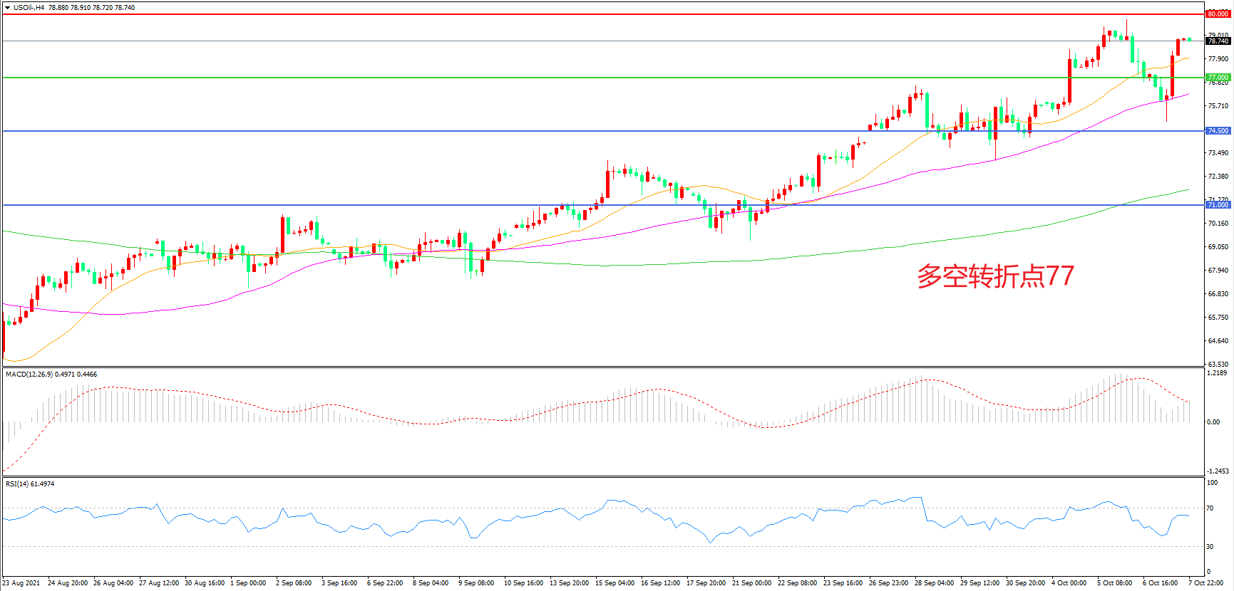 周四(10月7日),美国参议院多数党领袖舒默宣布,已就提高短期债务上限达成协议,市场风险情绪改善,美国WTI原油震荡上行,收报78.77美元/桶。之前市场关注焦点一直在全球疫情局势、经济复苏紧张和供需变化方面,对油价的评估相对理性。而现在市场焦点已经聚焦在能源危机层面,在能源危机氛围下,市场会阶段性淡化原油市场一些利空因素,油价短期有望维持强势。