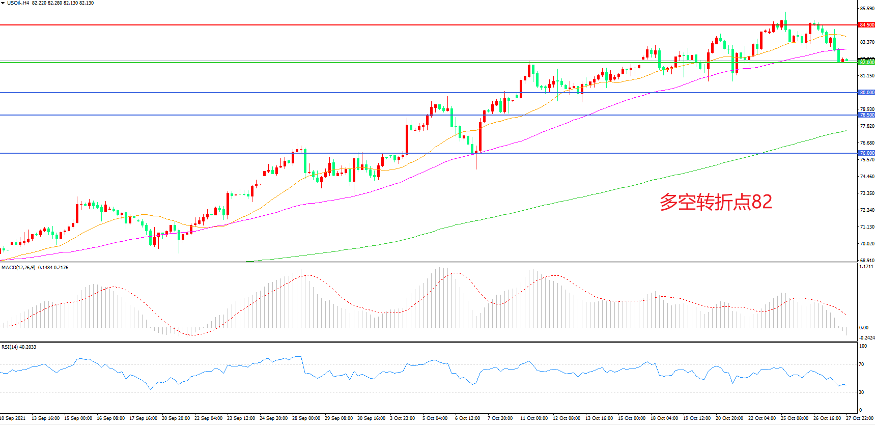 4小时图看,油价冲高回落,整体呈现区间震荡形态,84.5成为上方阻力,82成为下方支撑,MACD绿柱增加,RSI指标走平,日内延续震荡概率较大。