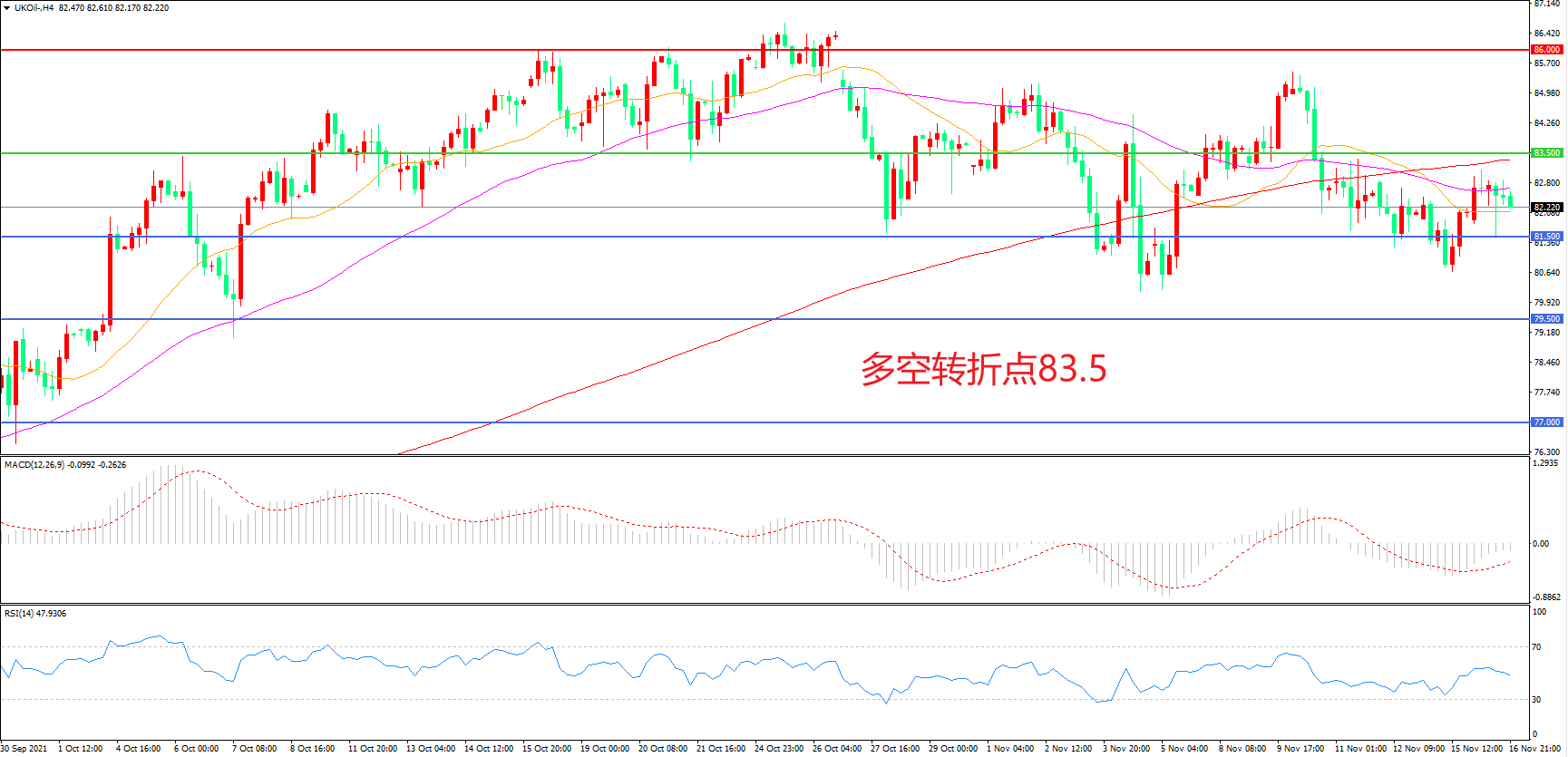4小时图看,油价整体呈现区间震荡形态,均线系统粘合成为上方阻力,81.5美元成为短期支撑,MACD绿柱缩短,RSI指标走平,日内震荡下行概率较大。