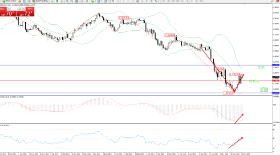 空头动力延续布林带指标下轨附近持续震荡下挫,低位抵达1.21555附近节点后开始反转震荡上移,触及布林带指标中轨附近节点开始整理,短期多头动力有继续向上移动态势,布林带指标呈收口走势后开始平移,上方压制关注1.27049附近,低位支撑关注1.21555附近,关注1.23975附近节点整理,MACD指标处于空头区域维持震荡上移,RSI指标处于空头区域维持震荡上移至50均衡线下侧徘徊中,如图: