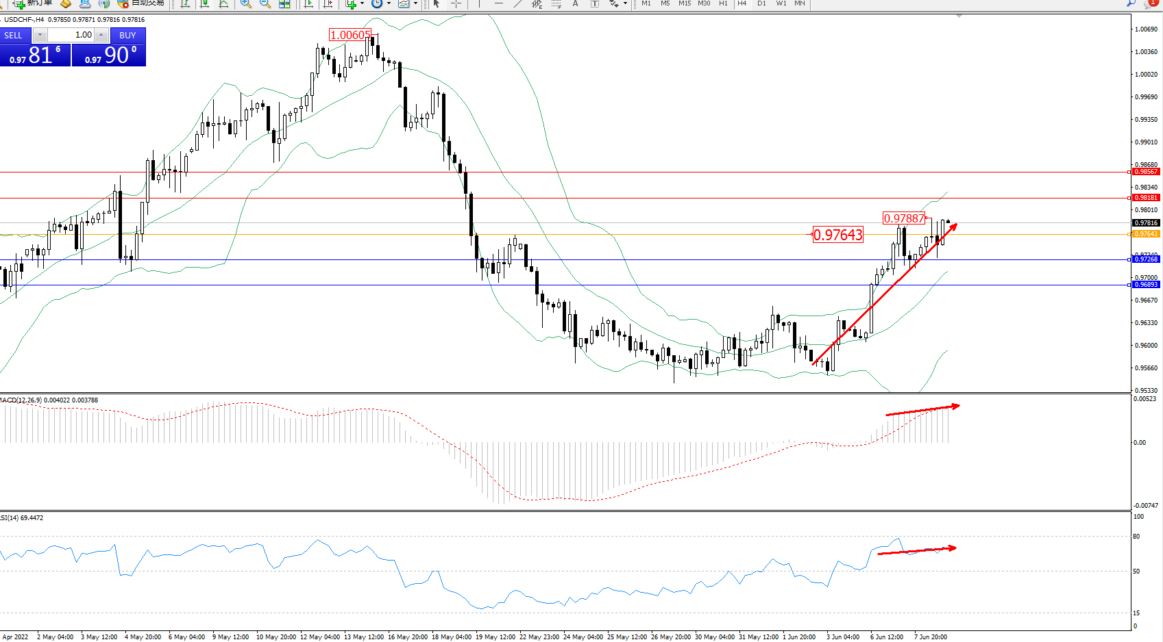 交易策略:0.97643上方看涨,目标0.98181、0.98567