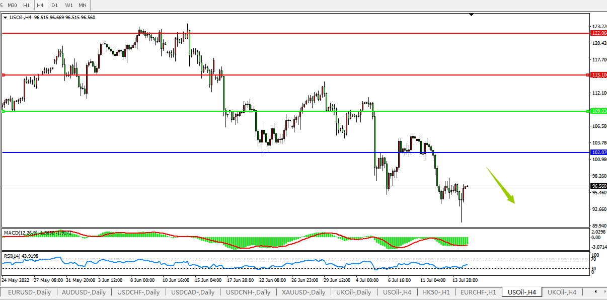 美油期货收跌0.5%,结算价报95.78美元/桶;盘中一度暴跌近6%逼近90美元。早前投资者关注美国本月晚些时候大幅加息的前景,这可能会遏制通胀,但也会打击石油需求