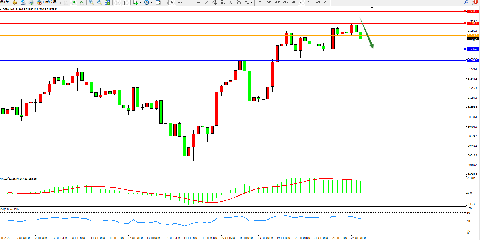 道琼斯指数7月22日(周五)收盘下跌136.29点,跌幅0.43%,报31900.61点;美联储加息预期弱化给美元指数压力。近期美元指数回落,交易员们降低了对美联储7月份激进加息100个基点的押注。