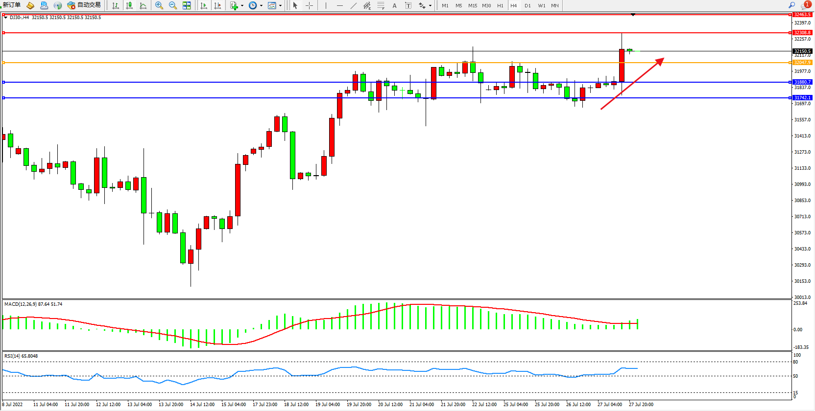 道琼斯指数7月27日(周三)收盘上涨435.58点,涨幅1.37%,报32197.12点;美联储公布最新的7月利率决议,美联储升息75基点,至2.25-2.50%不变,符合预期。