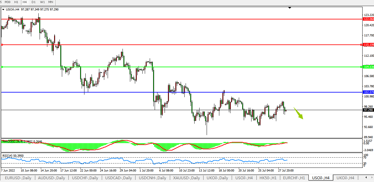 4小时图看:短线价格反弹后再度走弱, MACD量能柱0轴附近缩量,RSI指标走势窄幅整理,短期价格反弹后继续下行概率较大。