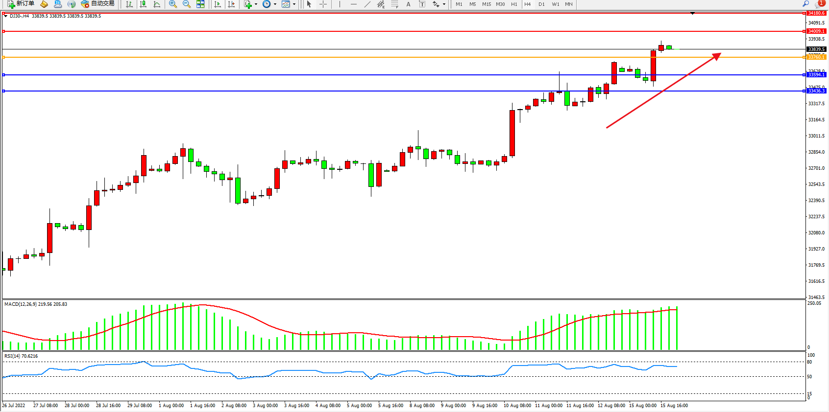 4小时图看:多头动力维持震荡上扬,短期多头有继续向上移动态势,MACD指标处于多头区域高位整理,RSI指标处于多头区域高位整理;