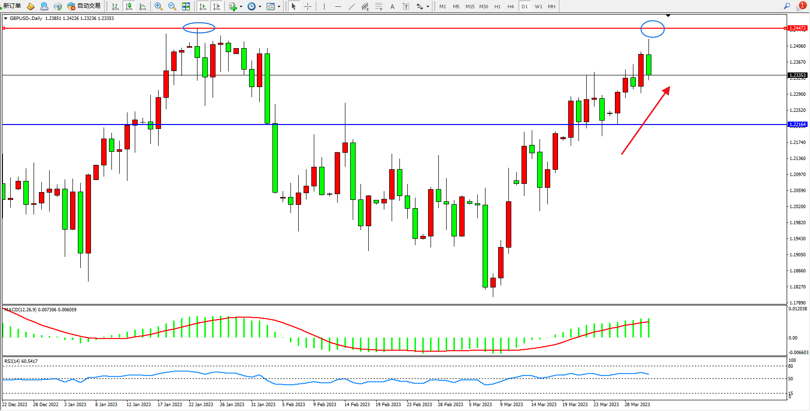 多头动力持续震荡上扬,短期尚未抵达此前高位便遇阻回撤,市场空头情绪开始有伺机入场迹象,上方压制关注1.24773附近,低位支撑关注1.22164附近,MACD指标处于多头区域缓慢上行,RSI指标处于50均衡线上侧徘徊,如图: