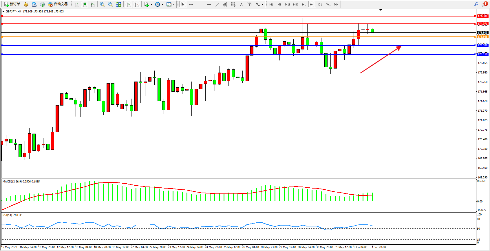 4小时图看:高位多头动力维持震荡上行,短期看涨情绪笼罩,市场多头不断向上移动中,MACD指标处于多头区域维持整理,RSI指标处于50均衡线上側弱势徘徊;