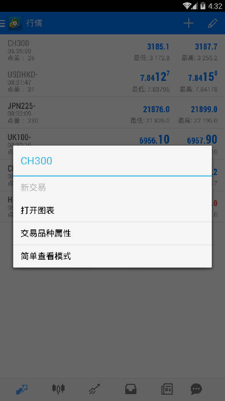 2.在交易页面,长按交易订单,弹出如下窗口。可选择对该订单进行平仓、修改订单、新订单或图表。