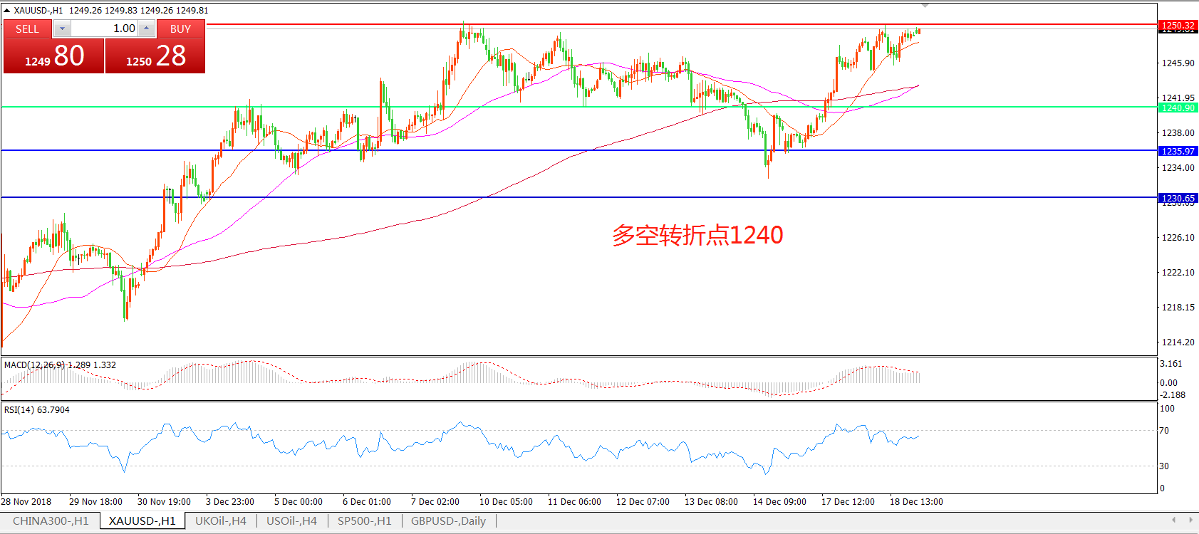现货黄金周二(12月18日)继续反弹,美市盘中在触及日内高位1250后回落,走势震荡,仍运行在1240一线上方,上方阻力咫尺之间。北京时间12月20日本周四凌晨,美联储将公布最新利率决议。若美联储表现鸽派将意味着明年的加息将会不是那么严格,这对黄金来说无疑是利好的。